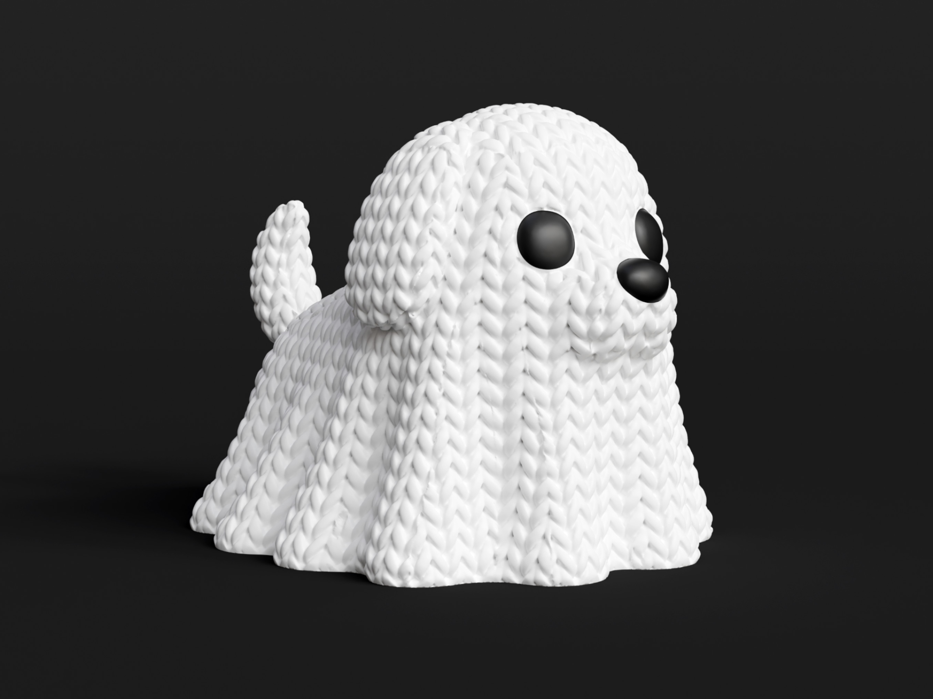 Ghost Dog, a 3d printed figurine designed to capture the look of knitted yarn.